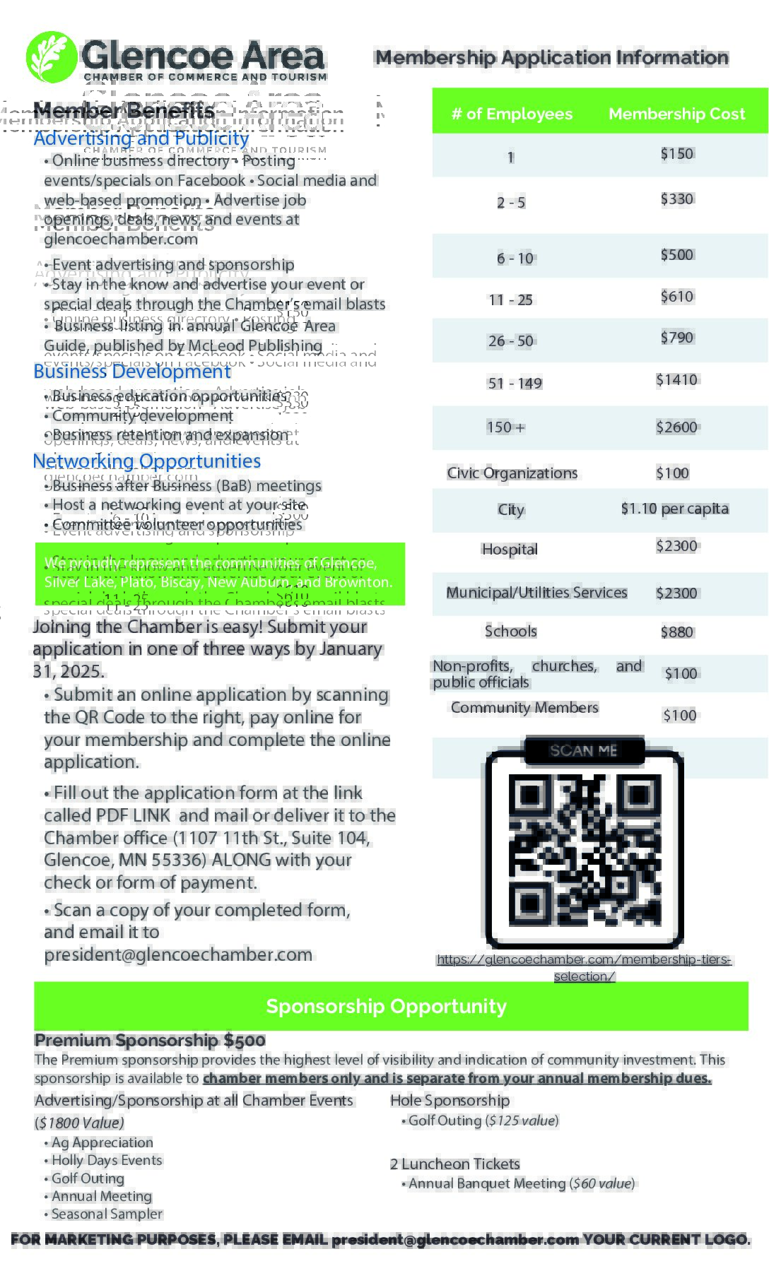 • Fill out the application form by clicking the link below and mail or deliver it to the Chamber office (1107 11th St., Suite 104, Glencoe, MN 55336) ALONG with your check or form of payment.